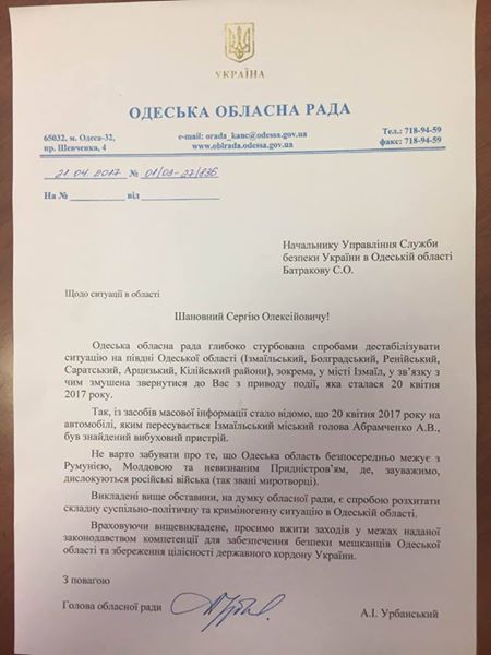 Глава Одесского областного совета Анатолий Урбанский обратился в к главе управления Службы безопасности Украины в Одесской области Сергею Батракову с просьбой принять меры для недопущения дестабилизации политической ситуации в регионе.
