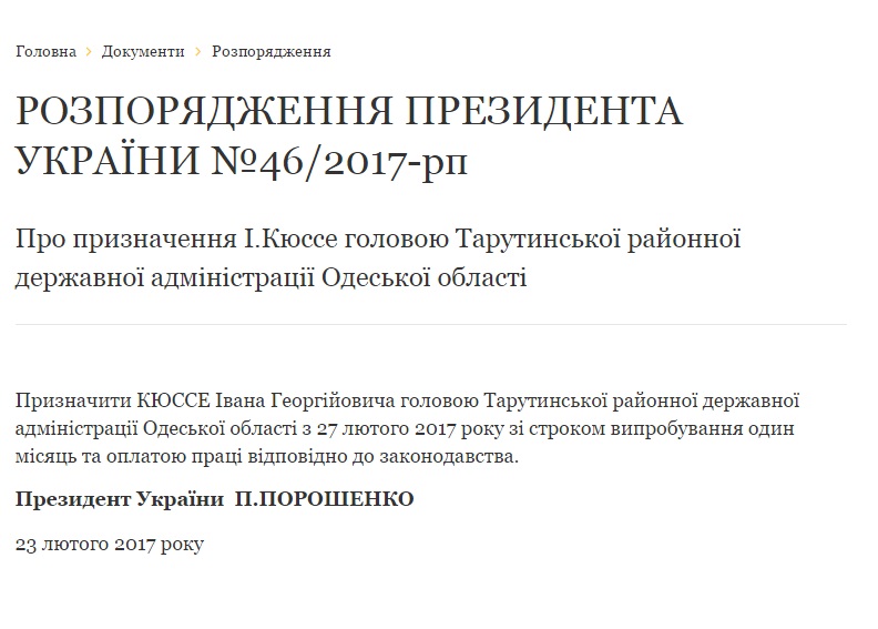 Президент Украины Петр Порошенко подписал распоряжение о назначении председателя Тарутинской районной администрации.