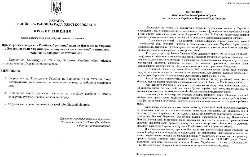 Депутаты Ренийского районного совета приняли решение об обращении к Президенту Украины и Верховной Раде Украины «О недопустимости дискриминации по языковому признаку и запрещения праздничных дат».