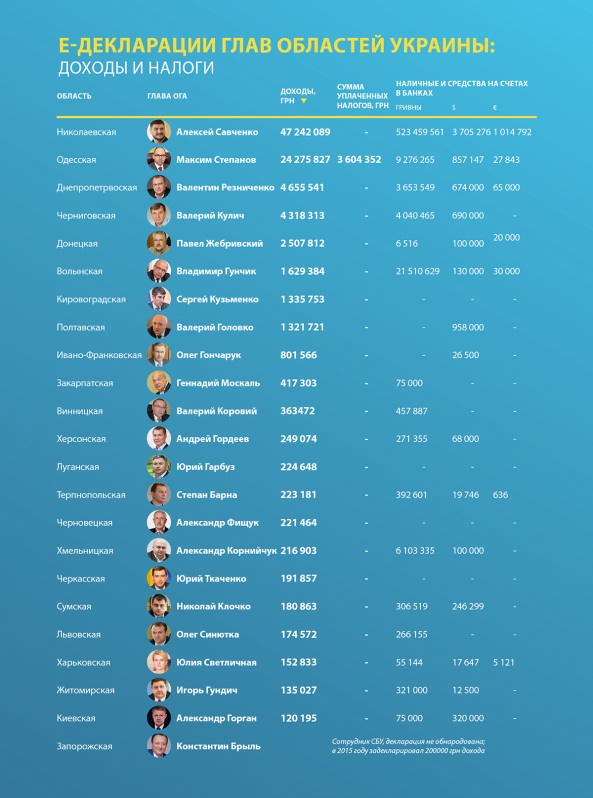 Безусловным лидером по доходам является глава Николаевской областной госадминистрации Алексей Савченко. В прошлом году он заработал более 47 млн грн. Он же лидирует по объемам денег в банках и в виде наличных: ему принадлежат астрономические 523 млн грн, 3,7 млн долларов и более 1 млн евро. Только в одном банке он держит более 270 млн грн и еще 290 млн он одолжил одной из компаний. Алексей Савченко также занимает первую строчку среди всех губернаторов по нематериальным активам – ему принадлежат авторские права на пять десятков песен.
