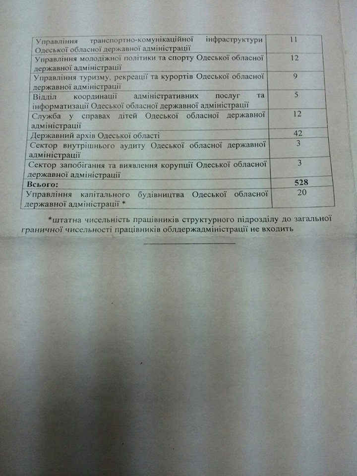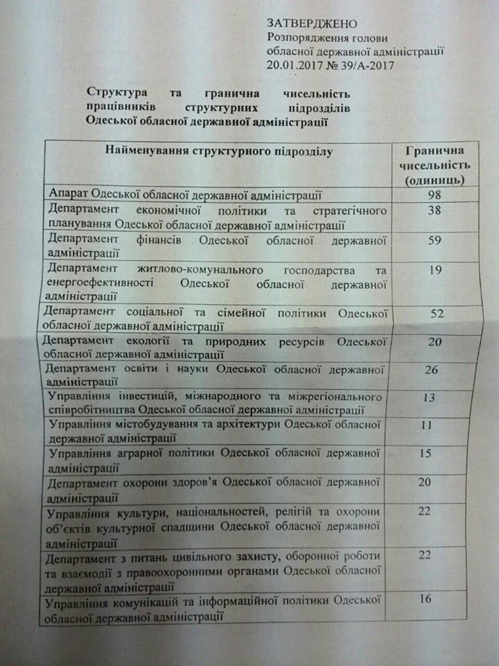 Напомним также, что председатель Одесской областной государственной администрации Михеил Саакашвили 23 июля 2015 года подписал распоряжение №452/А-2015 «О структуре и предельной численности работников структурных подразделений Одесской областной государственной администрации», которым сократил количество структурных подразделений ОГА с 27 до 13, а штат обладминистрации с 781 человека до 401 сотрудника.