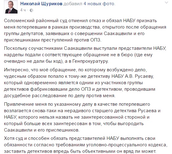 «Поскольку соучастниками Саакашвили выступали представители НАБУ, нардепы подали соответствующее обращение не в бюро, а в Генпрокуратуру. Интересно, что мое обращение, по которому возбуждено дело, попало к тому же детективу НАБУ А.В. Русаеву, который одновременно является одним из участников группы детективов работавших по делу ОПЗ и детективом, проводившим досудебное расследование по делу против меня.