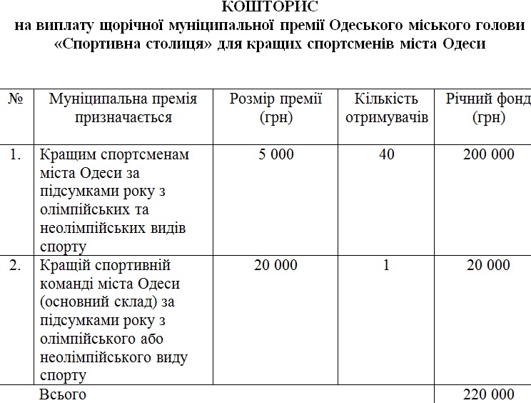 В этом году она в общей сумме будет равна 220 тысяч гривень – 200 тысяч гривень лучшим спортсменам города Одессы по итогам года по олимпийским и неолимпийским видам спорта в размере 5 тысяч грвень до 40 человек, а 20 тысяч гривень - лучшей спортивной команде города Одессы - основу составу по итогам года.