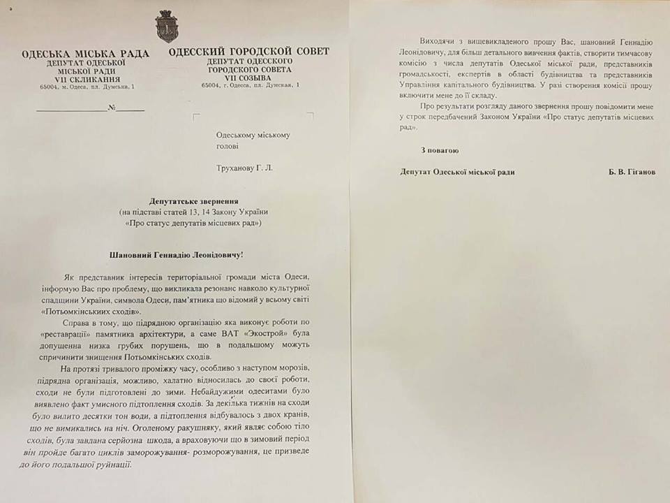 В свою очередь депутат Одесского городского совета Богдан Гиганов обратился к мэру Одессы Геннадию Труханову с просьбой создать временную комиссию из депутатов, представителей общественности и экспертов в области строительства и реставрации для контроля выполнения работ подрядчиком и соблюдения технологии реставрации памятника архитектуры национального значения – Потемкинской лестницы.