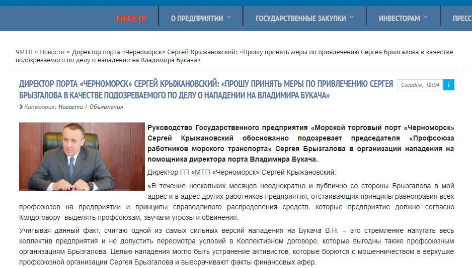 "Прошу принять меры по привлечению Сергея Брызгалова в качестве подозреваемого по делу о нападении на Букача В.Н., поскольку согласно его угроз, следующей атаке могут быть подвержены также лидеры профсоюзов «Солидарность» Жданова Н.А. и «Профсоюз работников морского порта «Черноморск» Иванов О.И. Что такое профсоюз Брызгалова – это рэкет бизнеса в порту; мошенничество с профсоюзными деньгами и взносами портовиков; кредитные аферы и выдача ссуд под откат; адвокатская контора на прикрытие бездельников, воров и пьяниц; «самооборона порта» в виде титушек, которые запугивают работников порта; провокации в других портах и городах; выступления против правительства Украины и реформ в отрасли; полное уничтожение объектов предприятия; финансирование за счет денег порта и профсоюзных взносов партии (акции, демонстрации и тд.) «Батькивщина»; аферы с имуществом порта и земельными участками; присвоение себе денег из профсоюзной кассы», - сказано в заявлении.