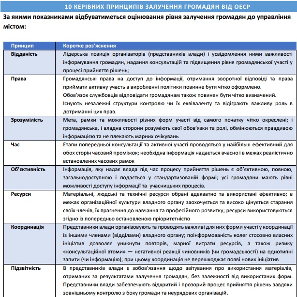 Проект «Впровадження в Україні 10 принципів успішного залучення громадян до процесу прийняття рішень від ОЕСР виконується Одеською обласною організацією ВГО «Комітет виборців України» в партнерстві з Регіональними ресурсними центрами з розвитку самоорганізації та місцевої демократії в Луганській, Волинській та Чернігівській областях за підтримки МФ «Відродження». Проект спрямовано на підвищення рівня залучення громадян до процесу прийняття рішень на місцевому рівні та збільшення поінформованості населення про практики та можливості залучення до процесу прийняття рішень в чотирьох обласних центрах України. Оцінку рівня залучення громадян до вироблення міської політики розроблено на основі змісту «10 керівних принципів залучення громадян до вироблення політики ОЕСР». Позиція Міжнародного Фонду «Відродження» може не співпадати з думками та точками зору авторів. Думки та позиції авторів також не відображають думки та позиції ОЕСР.