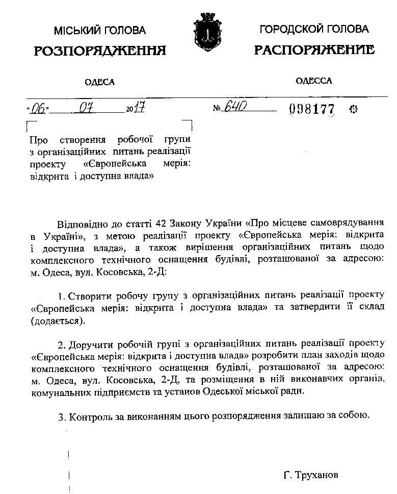 Городской голова Одессы Геннадий Труханов подписал распоряжение о создании рабочей группы по организационным вопросам реализации проекта «Европейская мэрия: открытая и доступная власть».