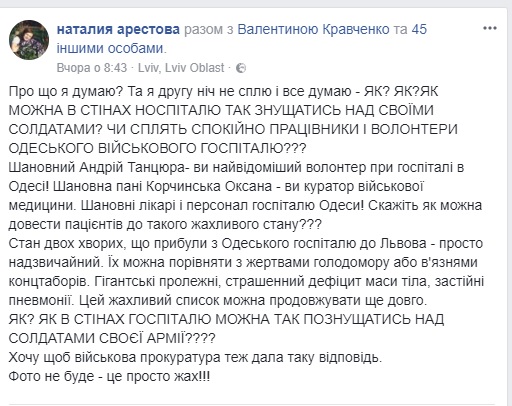 В частности, волонтер сообщала о том, что двое военнослужащих, переведенных во Львовский военный госпиталь из Одессы, из-за ненадлежащего лечения доведены до ужасного состояния (пролежни, дефицит массы тела, застойные пневмонии и т.д.).