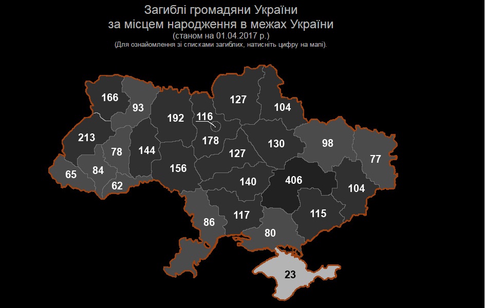 Отметим также, что по данным карты, созданой командой проекта «Книга памяти павших за Украину» при поддержке Национального военно-исторического музея в 2016 году с начала проведения АТО и по первое апреля 2017 года в зоне проведения операции поибли 86 жителей Одесской области.