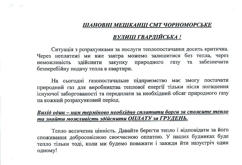 "Уважаемые жители пгт. Черноморское, улиц Гвардейская и Солнечная. Убедительная просьба оплатить за коммунальные услуги (поквартирные списки прилагаем). В случае расхождения указанных данных рекомендуем для проведения сверки обратиться в бухгалтерию ЖКХ. В ходе проведения переговоров с «Нафтогазом» и «Одесагазом» сроки отключения котельной от газа перенесены на 07.01.2017 года. В случае неуплаты долгов за потребленные коммунальные услуги наши дома останутся без тепла", - сообщила она и опубликовала списки должников.
