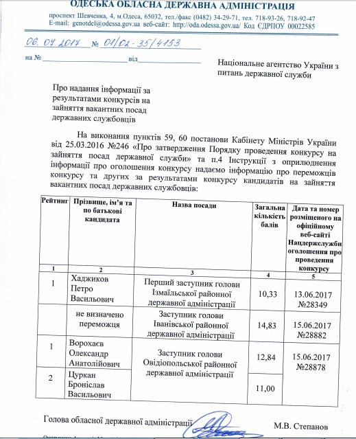 Национальное агентство по вопросам государственной службы опубликовало результаты конкурсов на должности заместителей председателей районных государственных администраций в Овидиопольском и Измаильском районе.