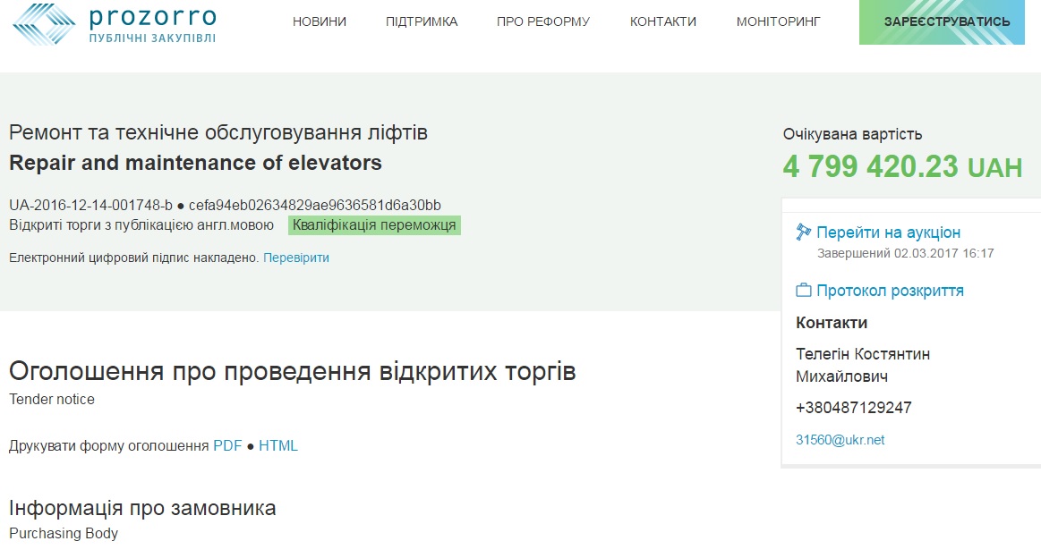 Соответствующая информация опубликована в электронной системе закупок Prozorro.
