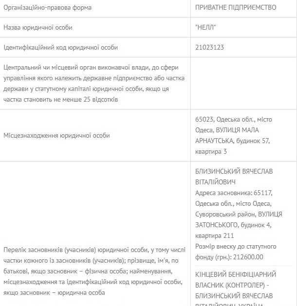 По данным единого государственного реестра юридических лиц, физических лиц-предпринимателей и общественных формирований ЧП «Нелл» зарегистрировано в доме по адресу Малая Арнаутская, 57. Конечным бенефициаром является Вячеслав Близинский, который как указано в реестре зарегистрирован на улице Затонского.