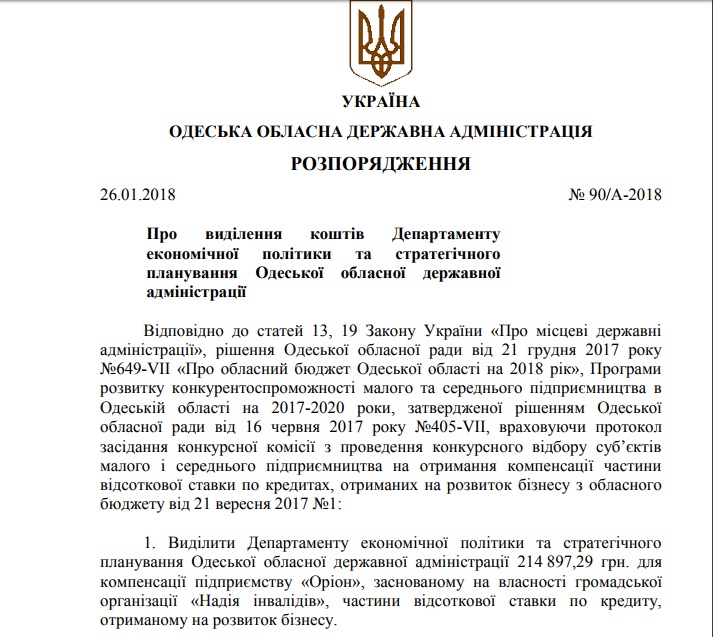 Как следует из документа, опубликованного пресс-службой ОГА, деньги выделяются для компенсации предприятию «Орион», основанном на собственности общественной организации «Надія інвалідів», части процентной ставки по кредиту, полученному на развитие бизнеса.
