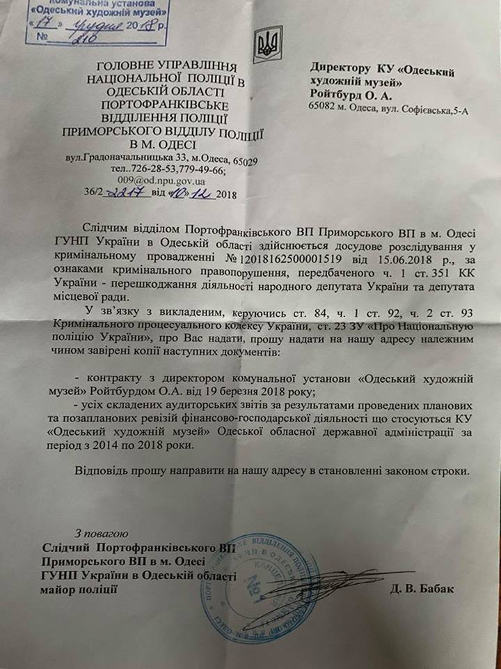 Следователь Портофранковского отдела полиции Одессы Денис Бабак затребовал у директора Одесского художественного музея Александра Ротбурда отчет о деятельности учреждения с 2014 по 2018 годы.