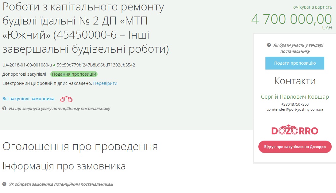 По данным системы, компания-победитель должна будет закончить ремонт до 1 июля 2018 года. За ремонт столовой порт заплатит 4 миллиона 700 тысяч гривень. Аукцион состоится 25 января.