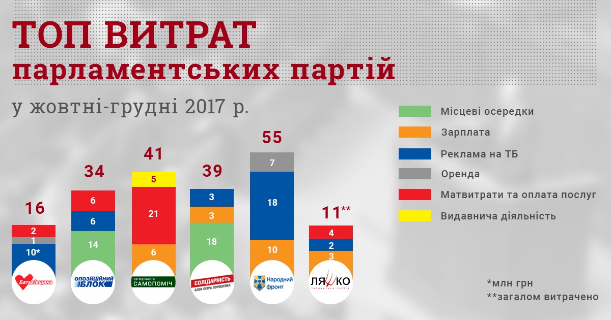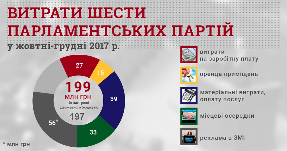 Парламентские политические партии потратили 199 миллионов гривень на протяжении октября-декабря 2017 года и 56 из них потрачены на рекламу
