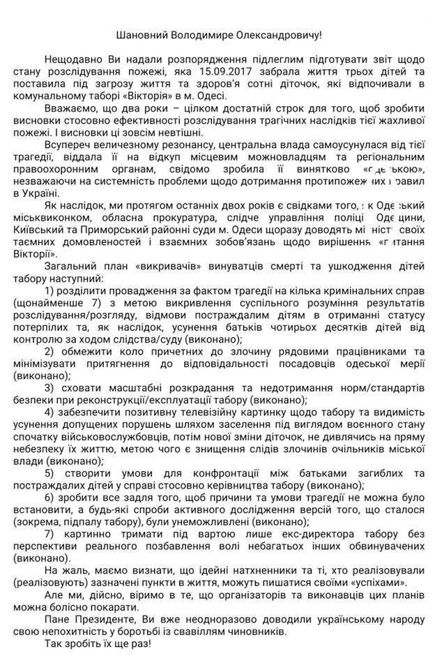 В сообщении говорится, что в начале сентября, на встрече с руководством парламента президент Украины Владимир Зеленский поручил подготовить доклад по трем трагедиям, унесшим жизни детей и имеющим большой резонанс в Украине. Одно из дел, доклад о котором ожидает президент Украины от своих подчиненных - дело о пожаре в одесском лагере «Виктория», который унес жизни трех девочек.