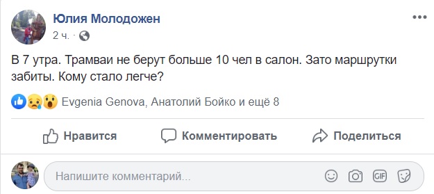 Как сообщают одесситы, такие действия водителей вызывают агрессию у потенциальных пассажиров: в районе Марсельской недовольные перекрывали рельсы, требуя везти всех, а не по 10 человек в вагоне, в трамвае №10 возмущенные выбили стекло, а в вагоне трамвая №20 вообще угрожали водителю ножом.