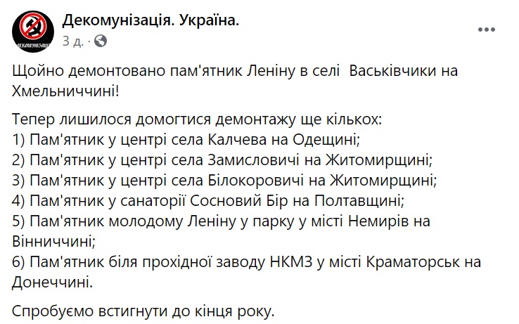 Об этом сообщили на странице группы в Facebook, сообщив о сносе памятника «вождю пролетариата» в селе Васьковчики в Хмельницкой области.