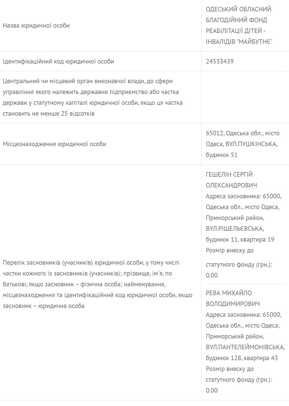 Согласно единому реестру юридических лиц, физических лиц-предпринимателей и общественных формирований основателями Одесского областного благотворительного фонда реабилитации детей - инвалидов «Майбутнє» являются хирург Сергей Гешелин и известный в Одессе скульптор и художник Михаил Рева.
