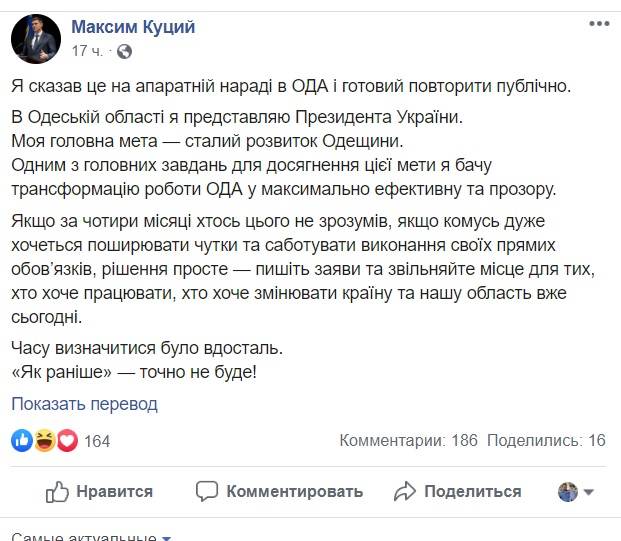 «В Одесской области я представляю Президента Украины. Моя главная цель - устойчивое развитие Одесской области. Одной из главных задач для достижения этой цели я вижу трансформацию работы ОГА в максимально эффективную и прозрачную. Если за четыре месяца кто-то этого не понял, если кому-то очень хочется распространять слухи и саботировать выполнение своих прямых обязанностей, решение простое - пишите заявления и освобождайте место для тех, кто хочет работать», - написал он в Facebook.