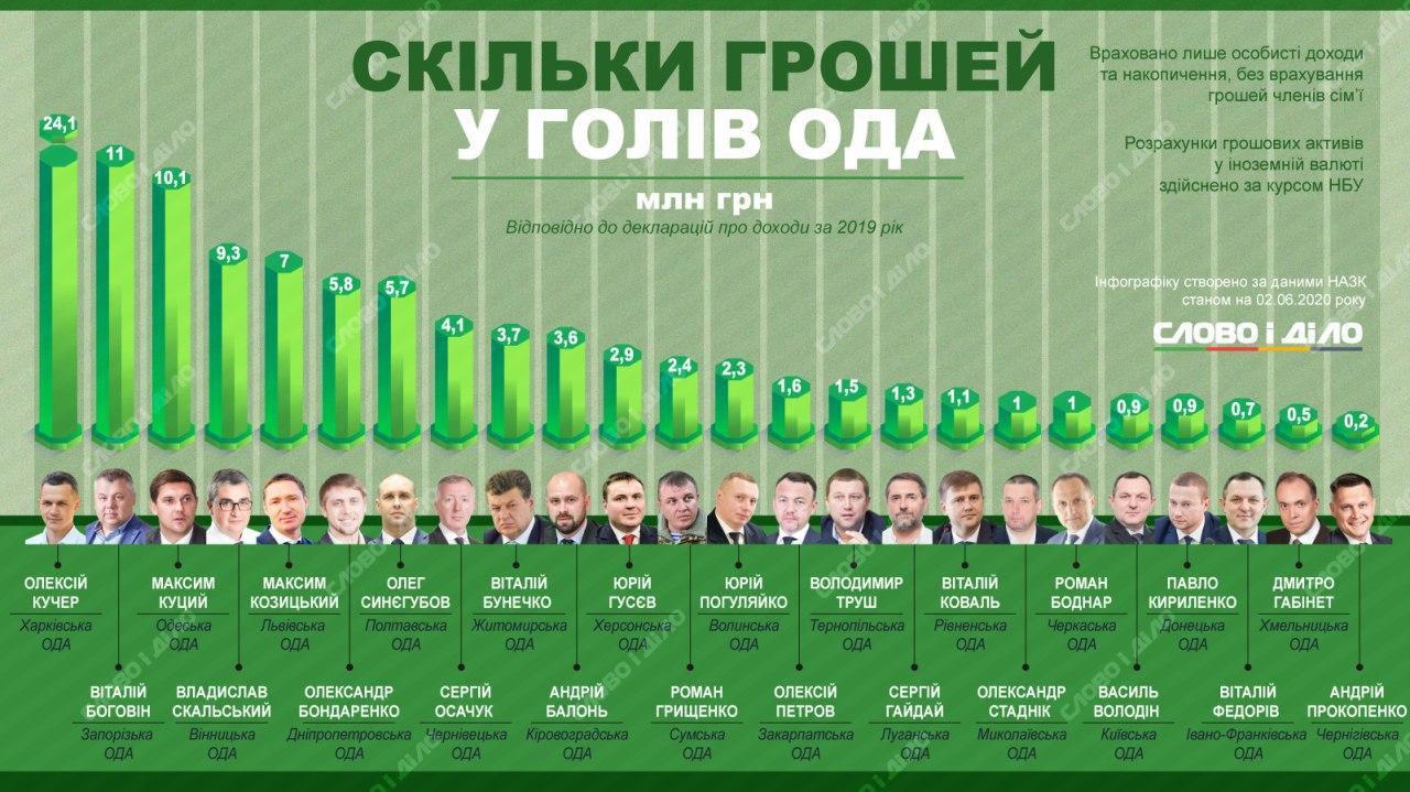 На первом месте председатель Харьковской ОГА Алексей Кучер. Его доходы составили 24,1 млн грн. Он получил 99 тыс. 638 грн зарплаты за три месяца как народный депутат IХ созыва по 179-му избирательному округу. Еще 34 тыс. 950 грн Кучер заработал уже в должности председателя ОГА. В качестве дополнительного блага в декларации указано 22 тыс. 300 грн от партии «Слуга народа». Наличными Алексей Кучер держит 84 тыс. долл.