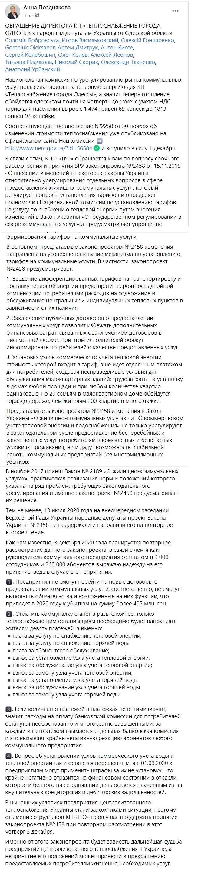 Начальница коммунального предприятия «Теплоснабжение города Одесса» Анна Позднякова обратилась в Facebook к народным депутатам, имеющим отношение к Одесской области, с просьбой поддержать два законопроекта.
