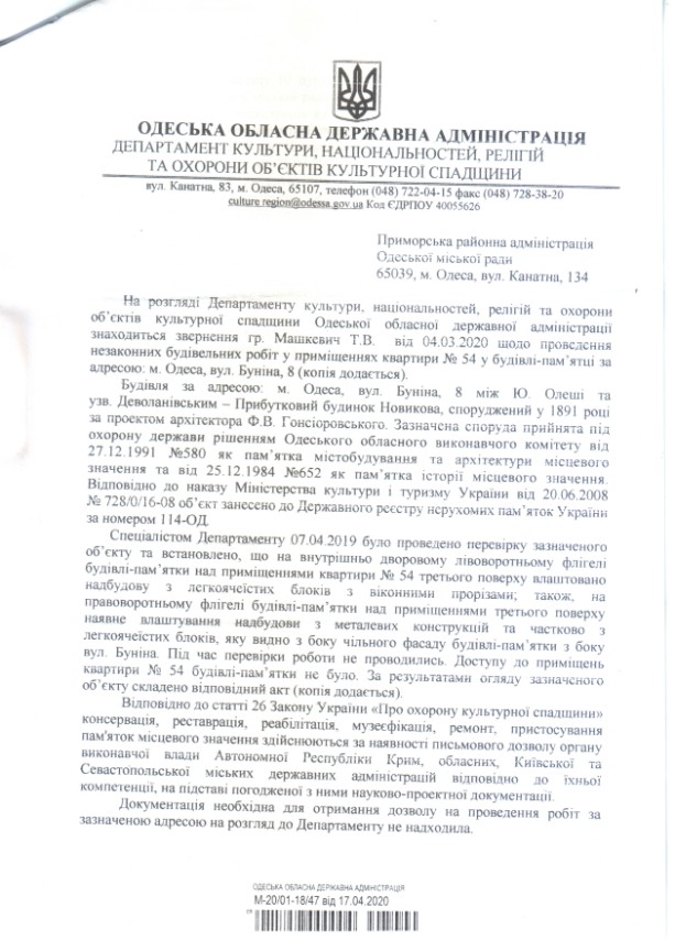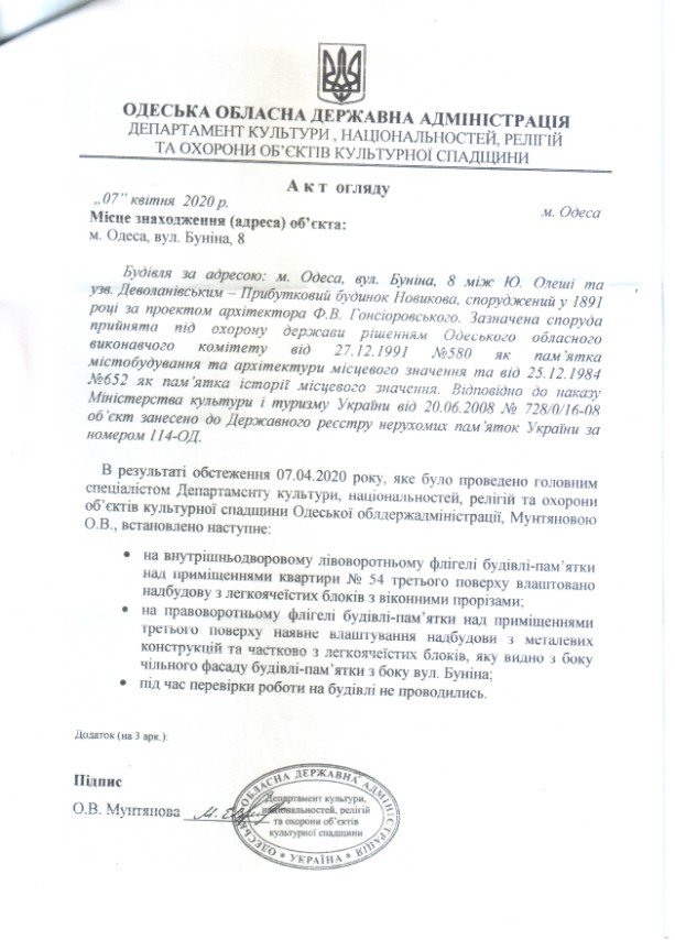 Департамент культуры, национальностей, религий и охраны объектов культурного наследия Одесской облгосадмиистрации провел осмотр надстройки над помещением квартиры №54 в доме по Бунина, 8, и тем самым подтвердил опубликованную ранее ИзбирКомом информацию о самовольном строительстве на памятнике архитектуры.