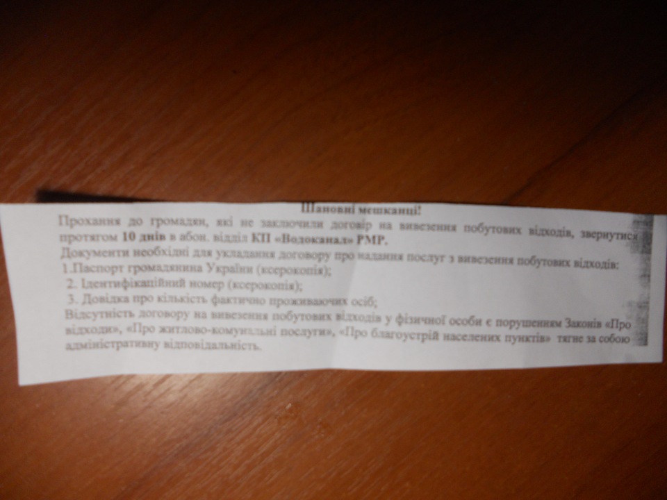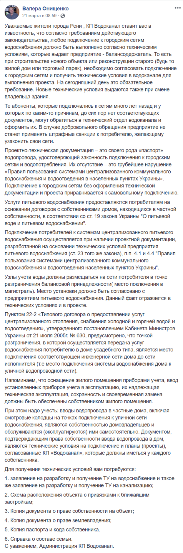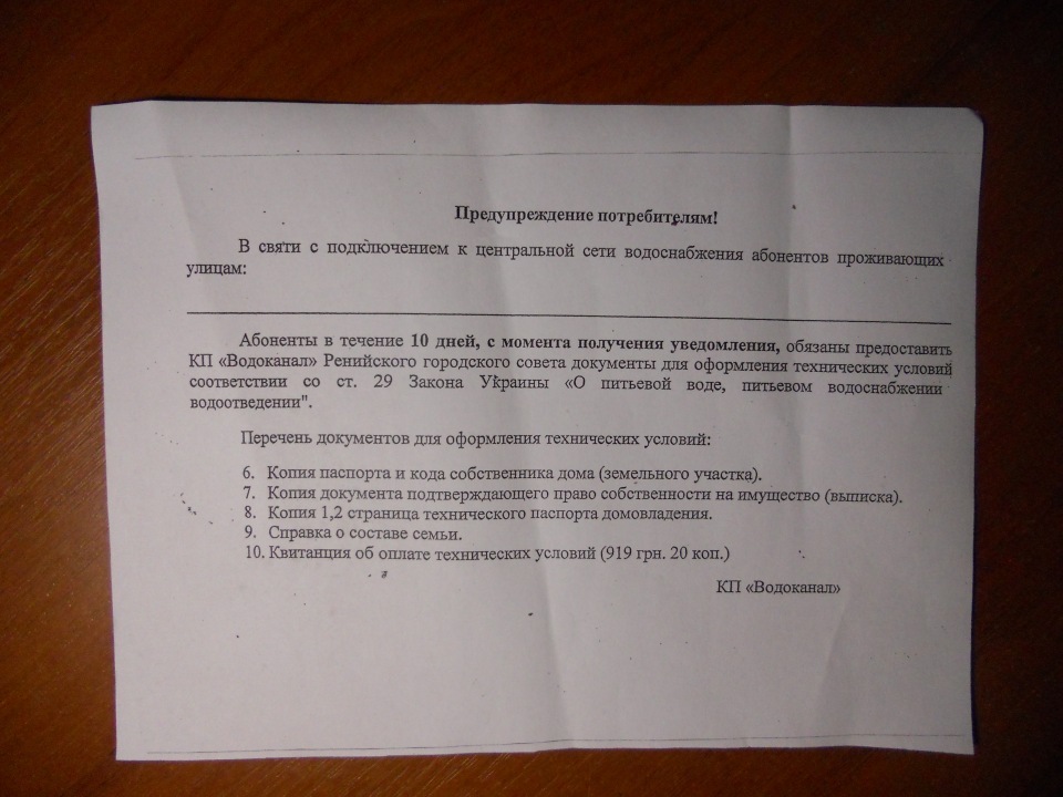 26-27 марта 2020 года жители частного сектора города Рени стали находить в своих почтовых ящиках «письма счастья», в которых в ультимативной форме от них требовали в течение 10 дней с момента получения «уведомления» предоставить в КП «Водоканал» пакеты документов на получение технических условий на подключения к водопроводным сетям города и на оформление договоров на вывоз мусора. Характерная деталь, оба эти «уведомления» по сути – анонимки. Эти «документы» не имеют даже признаков принадлежности к какой-либо организации или учреждению. Не говоря уже о фирменном бланке, подписи какого-либо должностного лица, заверяющей текст «уведомления», а тем более печати, эту подпись удостоверяющей. Это просто тексты, напечатанные на кусочках бумаги.
