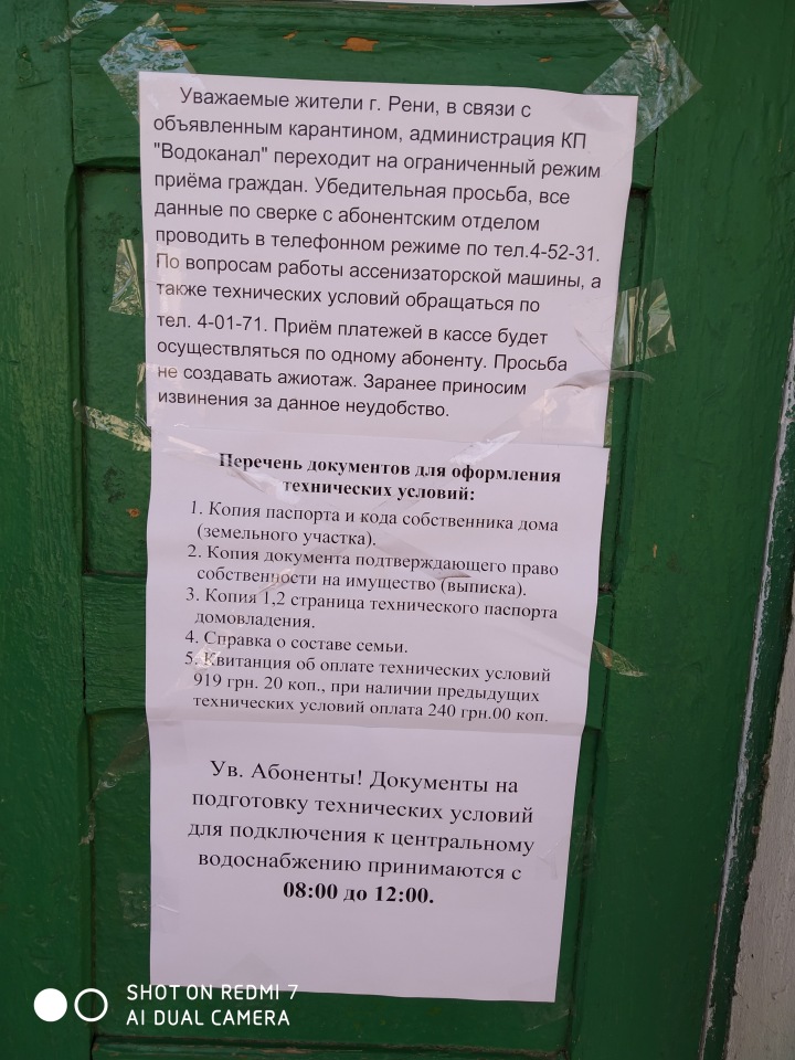 17 марта 2020 года в городе Рени официально объявлен карантин. Закрыты школы, детские сады, государственные учреждения, отдельные магазины. Граждан всячески призывают лишний раз не выходить из дома. На этом фоне жители частного сектора в середине 20-х чисел марта стали получать уведомления с требованием явиться в коммунальное предприятие «Водоканал» и оформить документы на подключение к водопроводу и на вывоз мусора.