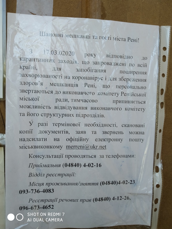 Напомним, с 17 марта все госучреждения в городе Рени закрыты для посещения. Районный совет, райгосадминистрация, районный суд, собес, отдел юстиции приём граждан не проводят, все документы и обращения по электронной почте. В таком же режиме работает и исполнительный комитет городского совета, о чём горожан и гостей города уведомляет объявление на его запертых дверях.
