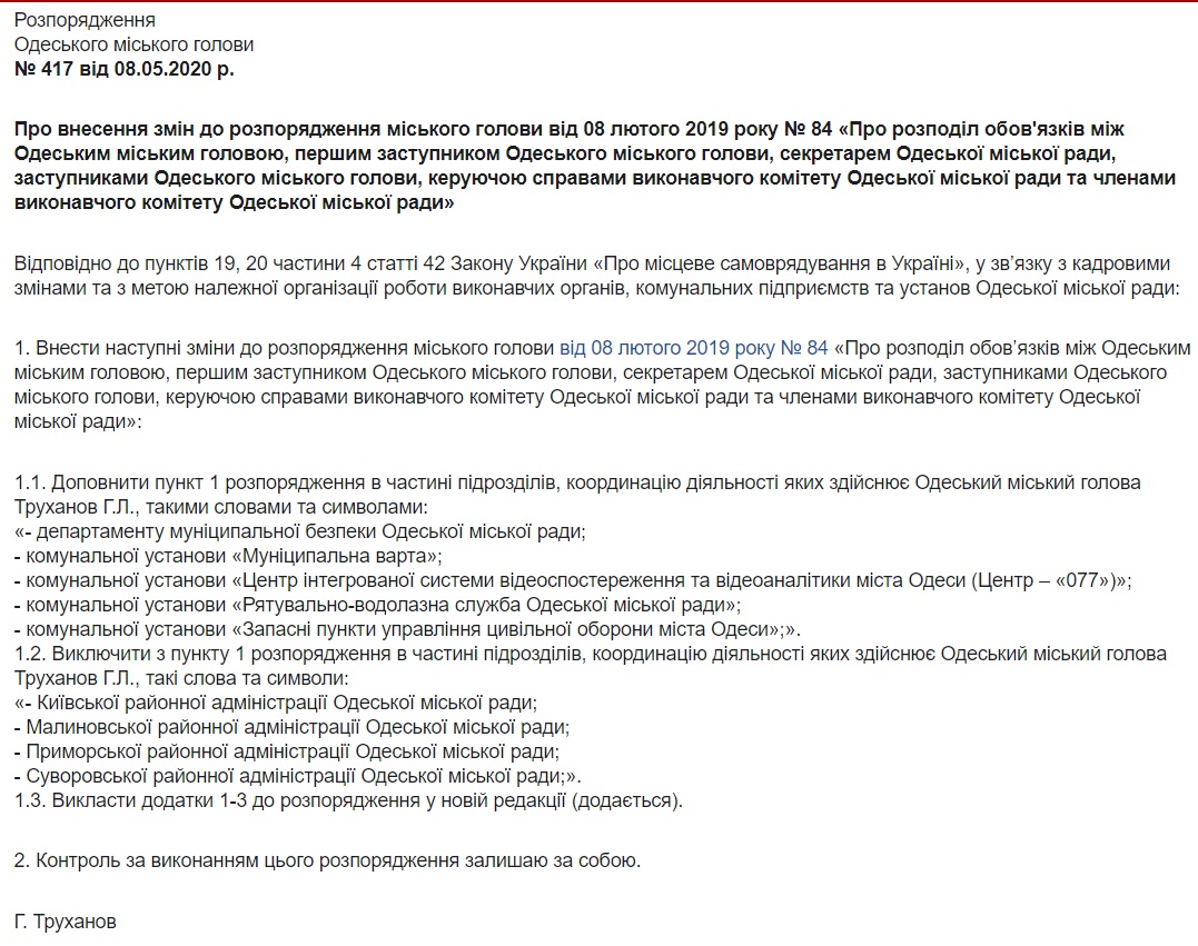 На этот раз, впрочем, заместители в документе не фигурируют, городской голова перераспределил свои зоны ответственности. В частности городской голова решил отказаться от кураторства районных администраций и сосредоточиться на департаменте муниципальной безопасности Одесского городского совета.