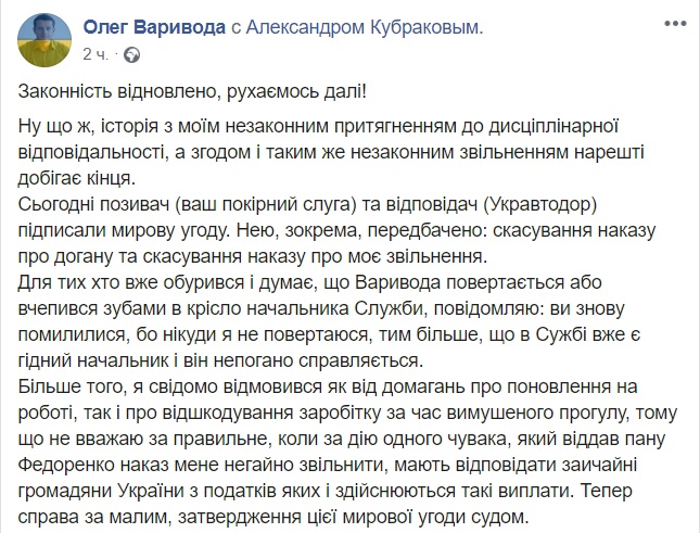 «Для тех кто уже возмутился и думает, что Варивода возвращается или вцепился зубами в кресло начальника Службы, сообщаю: вы снова ошиблись, потому что никуда я не возвращаюсь, тем более, что в службе уже есть достойный начальник, и он неплохо справляется. Более того, я сознательно отказался как от притязаний о восстановлении на работе, так и о возмещении заработка за время вынужденного прогула, так как не считаю правильным, когда за действие одного чувака, который отдал господину Федоренко приказ меня немедленно освободить, должны отвечать обычные граждане Украины, по налогам которых и осуществляются такие выплаты. Теперь дело за малым - утверждение этой мирового соглашения судом», - написал экс-глава САД в Одесской области.