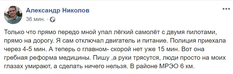 «Только что прямо передо мной упал легкий самолет с двумя пилотами, прямо на дорогу. Я сам отключал двигатель и питание. Полиция приехала через 4-5 минут. А теперь о главном: скорой нет уже 15 минут», - написал он.