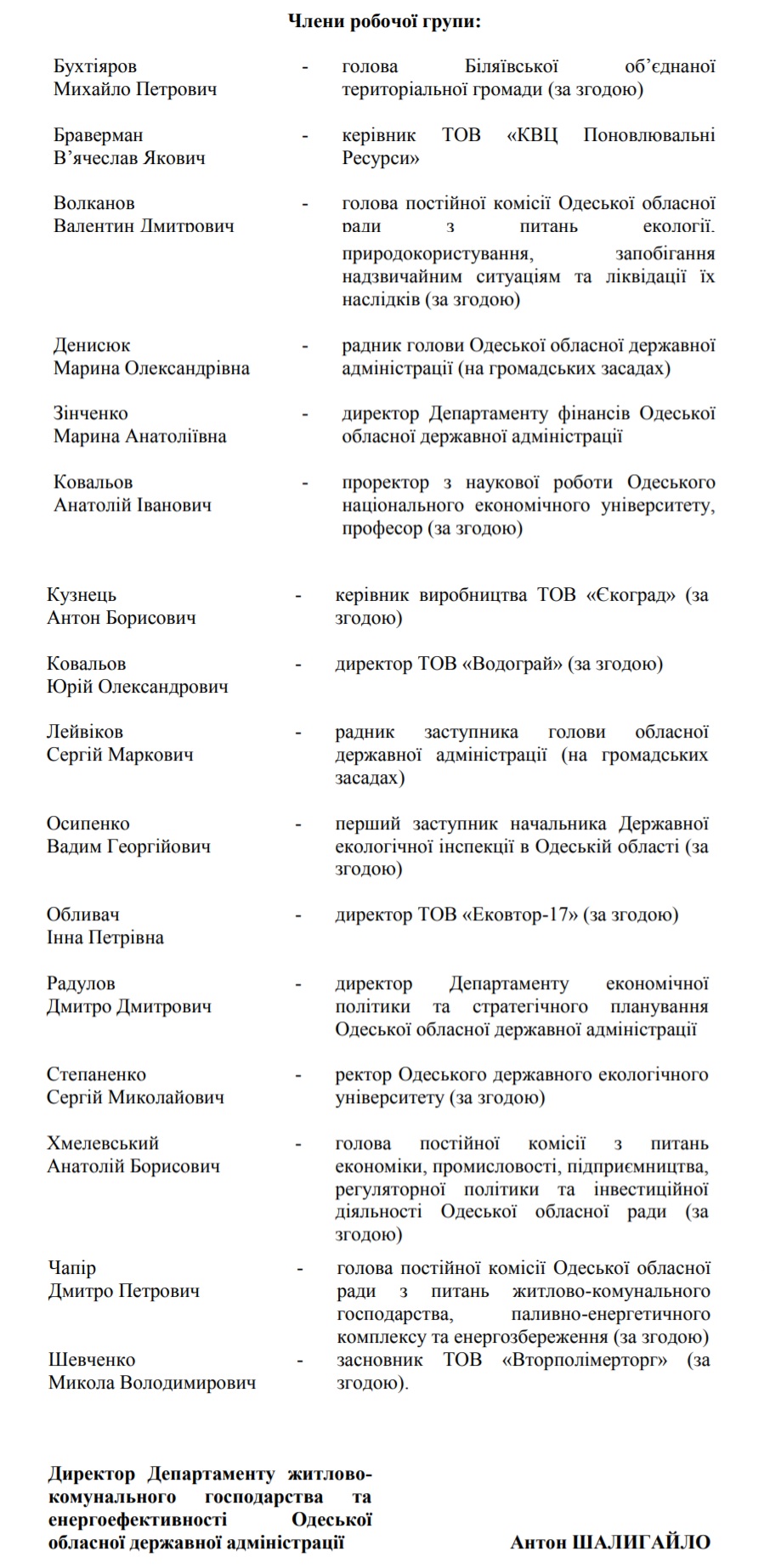 Возглавит группу заместитель главы ОГА Денис Ванаш. У него будет целых два заместителя: директор Департамента экологии и природных ресурсов Алан Джиоев и директор Департамента жилищно-коммунального хозяйства и энергоэффективности Антон Шалигайло. Главный специалист отдела жилищной политики и благоустройства систем жизнеобеспечения и жилищной политики Департамента жилищно - коммунального хозяйства и энергоэффективности Ольга Григорова станет секретарем.