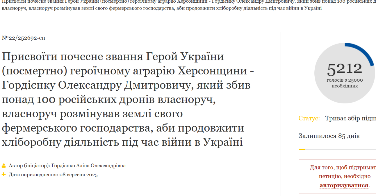 В петиции отмечается, что Александр Дмитриевич занимался аграрным делом с 1992 до 2022 года, выращивал хлеб вблизи Берислава и продолжал земледельческую деятельность во время войны, рискуя жизнью ради украинской земли.