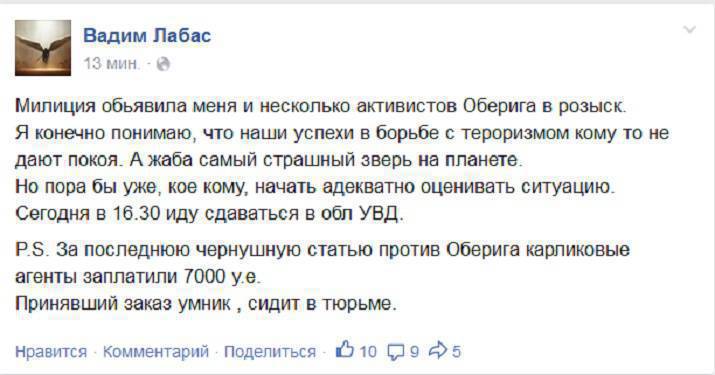 Лидер организации «Обериг» Вадим Лабас заявил, что идет сдаваться в милицию в связи с тем, что его объявили в розыск