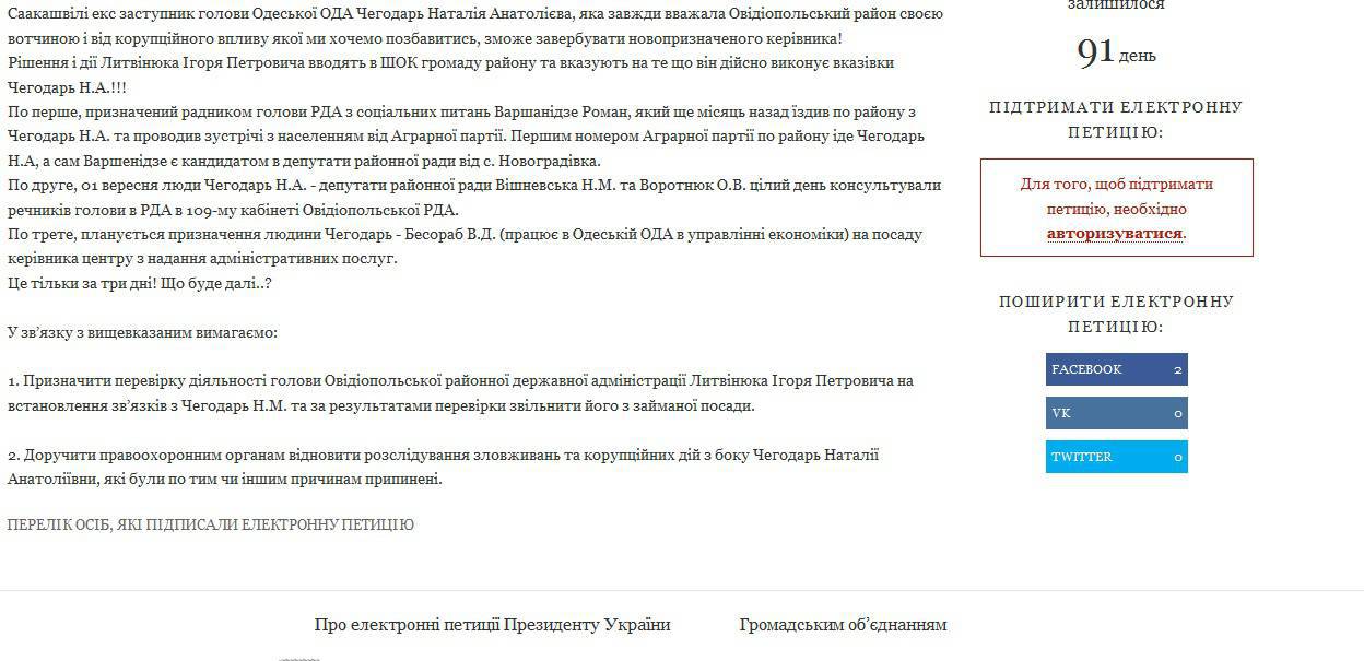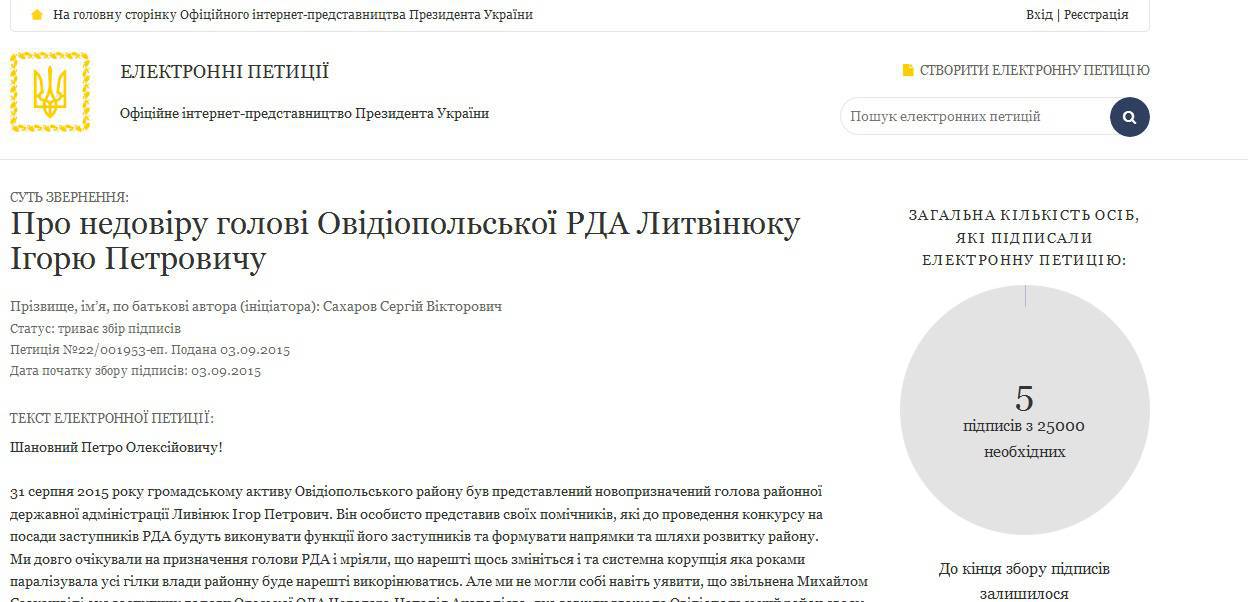 Петиция о недоверии главе Овидиопольской районной государстенной администрации Игорю Литвинюку зарегистрирована сегодня на сайте президента Украины Петра Порошенко