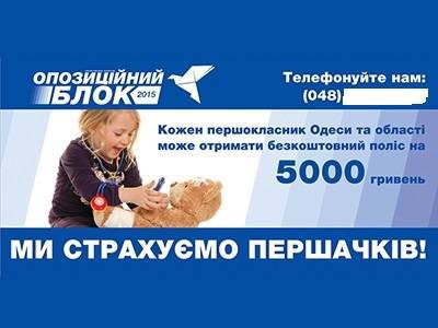 «К началу нового учебного года Оппозиционный блок подготовил для первоклашек всей Одесской области необычный подарок – индивидуальное страхование здоровья на весь учебный год. Оно предусматривает выплату страховой компанией «Днепринмед» до 5 тысяч гривен семьям ребят, которые получили механическую травму на спортплощадке, в классе или каким-либо другим образом пострадали в школе», – значится в статье.