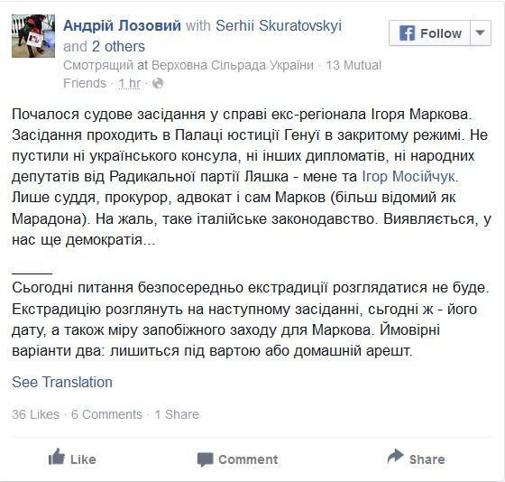 «Только судья, прокурор, адвокат и сам Марков. К сожалению, такое итальянское законодательство. Оказывается, у нас еще демократия», – написал он.