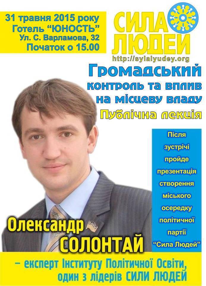 31 мая в отеле «Аркадия» выступит преподаватель, эксперт Института политического образования, один из лидеров объединения «Сила людей» Александр Солонтай.