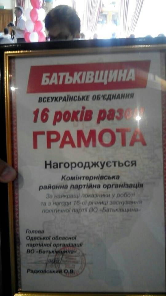 По случаю 16-летия всеукраинской организации партии «Батьківщина» грамотой за 1 место в Одесской области была награждена ячейка партии в Коминтерновском районе. Председателю партийной райорганизации Владимиру Скоромохе был вручен ценный подарок – наручные часы, – сообщают активисты Коминтерновской райорганизации ВО «Батьківщина».