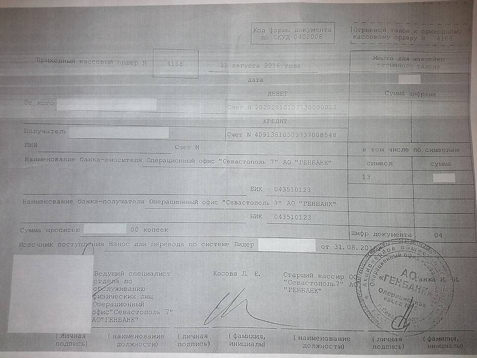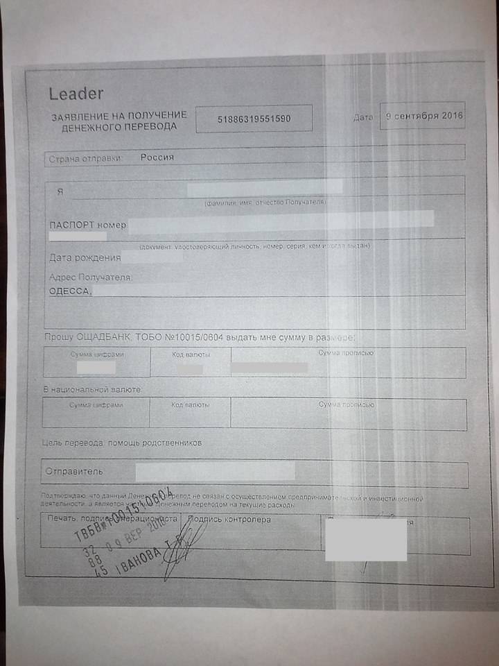 Согласно ее информации, украинский банк не только осуществляет денежные переводы с помощью системы Leader, которые отправляются в Севастополь, но и в бланке получателя в графе «Страна отправления» указано: «Россия».
