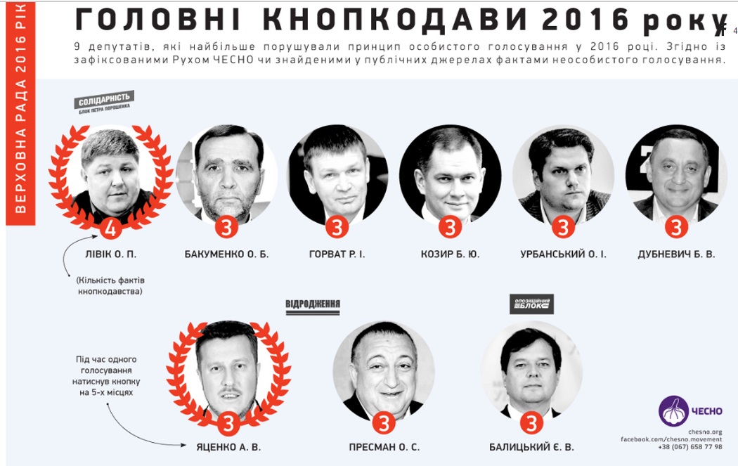 Согласно данным общественников, депутаты Александр Урбанский («Блок Петра Порошенко «Солидарность») и Александр Пресман («Видродження») в течение года трижды нажимали кнопки для голосования за коллег. Таким образом, депутаты делят второе место в рейтинге «главный кнопкодав года».
