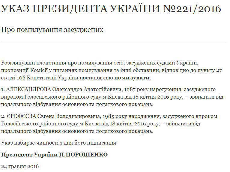 16:00 На сайте президента появился Указ о помиловании Ерофеева и Александрова, датированный 24 мая.