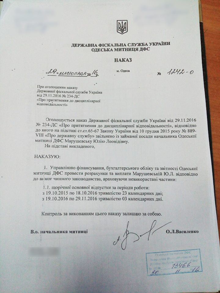 Начальник Государственной финансовой инспекции Роман Насиров подписал приказ об увольнении Юлии Марушевской с поста начальника Одесской таможни.