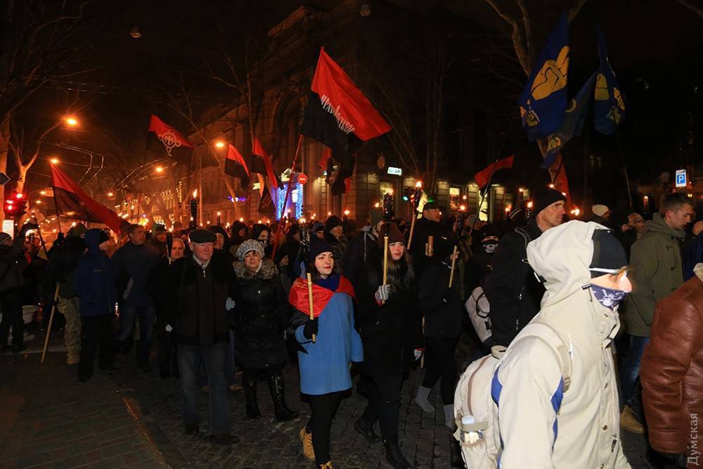 Несколько сотен активистов партий ВО «Свобода» и «Правый сектор» прошли с факелами по центральным улицам Одессы в честь 107-й годовщины со дня рождения идеолога и практика украинского национализма, лидера ОУН(б) Степана Бандеры.