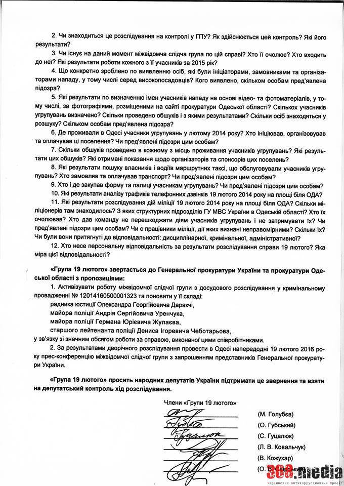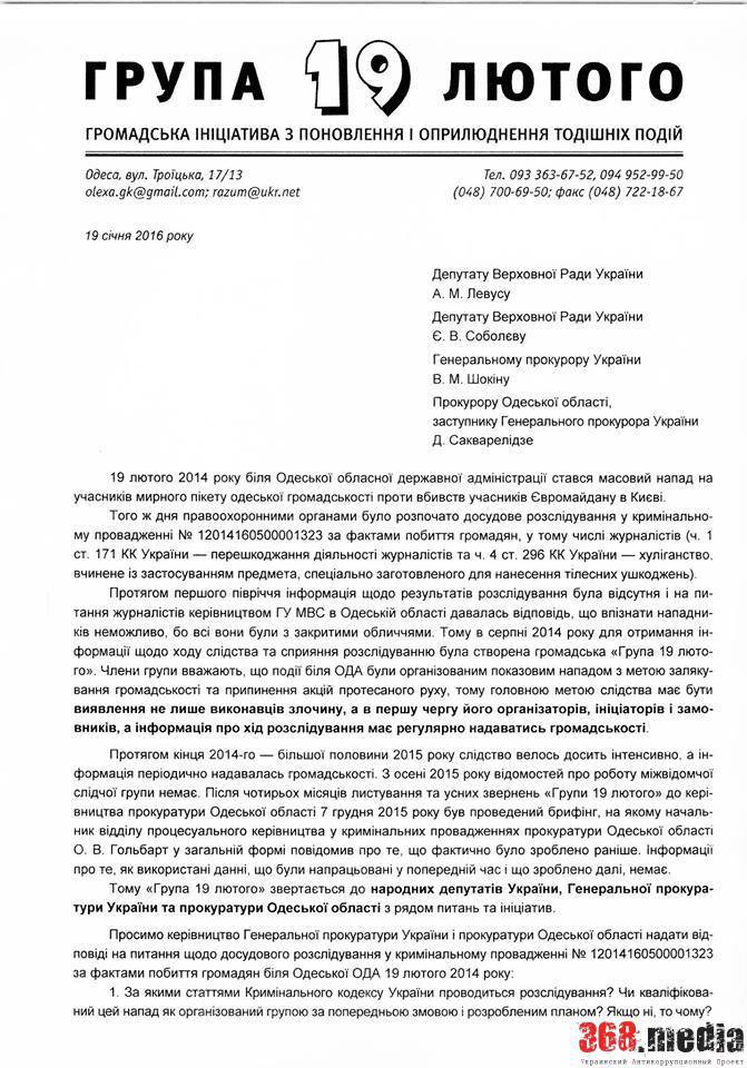 Группа «19 февраля» направила в Генпрокуратуру обращение с требованием объяснить, с какой целью затягивают сроки расследования резонансного инцидента у здания Одесской ОГА и когда виновные будут привлечены к ответственности.