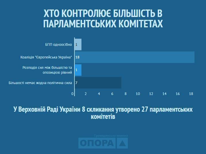 Анализ персонального состава парламентских комитетов свидетельствует, что коалиция "Европейская Украина", в которую по состоянию на июнь 2016 года входят фактически две политические силы ( "БПП" и "Народный фронт") и отдельные внефракционные депутаты, имеет большинство в 19 комитетах.